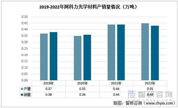 2019-2022年阿科力光学材料产销量情况(万吨)