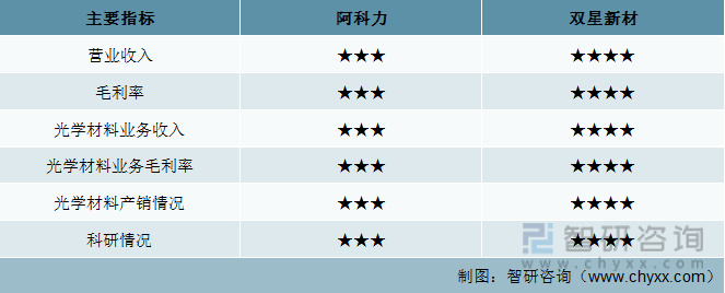 从各项指标来看,双星新材表现出更好的综合实力,在总营收、毛利率、光学材料业务营收、光学材料业务毛利率、光学材料产销及科研情况方面都较阿科力更胜一筹。