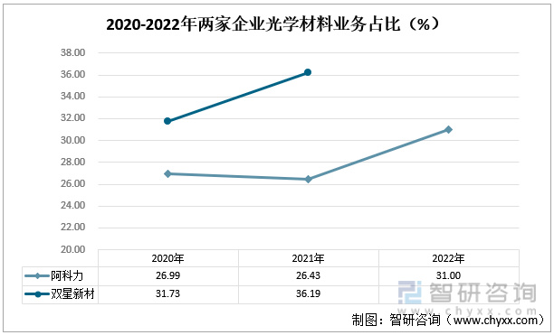 两家企业的光学材料业务占比大约在30%左右,双星新材的光学材料业务占比稍高于阿科力。2021年,双星新材的光学材料业务占比为36.19%,阿科力的光学材料业务占比为26.43%;2022年1-6月双星新材的光学材料业务占比为30.68%;2022年阿科力的光学材料业务占比为31.00%。
