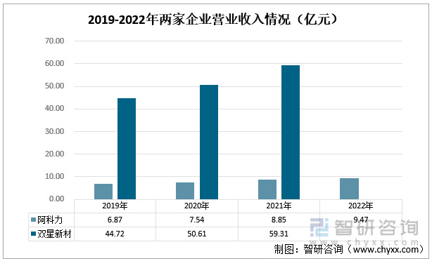 从两家公司营业收入情况来看,双星新材的营业收入大于阿科力。近几年两家公司的营业收入持续增加,阿科力的营业收入从2019年的6.87亿元增长到2022年的9.47亿元,双星新材的营业收入从2019年的44.72亿元增长到2021年的59.31亿元,2022年1-9月双星新材的营业收入为48.09亿元。