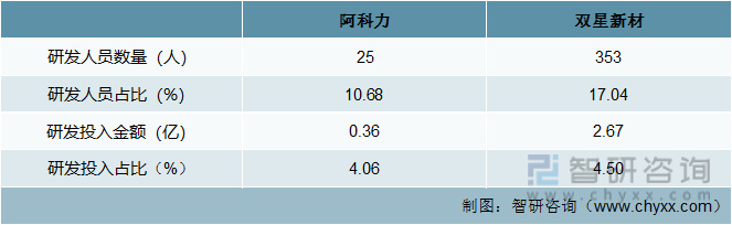 从科研情况来看,双星新材在研发人员数量、研发人员占比、研发投入金额和研发投入占比方面都高于双星新材。2021年,阿科力的研发人员数量为25人,占比为10.68%,研发投入金额为0.36亿元,占比为4.06%;双星新材的研发人员数量为353人,占比为17.04%,研发投入金额为2.67亿元,占比为4.50%。