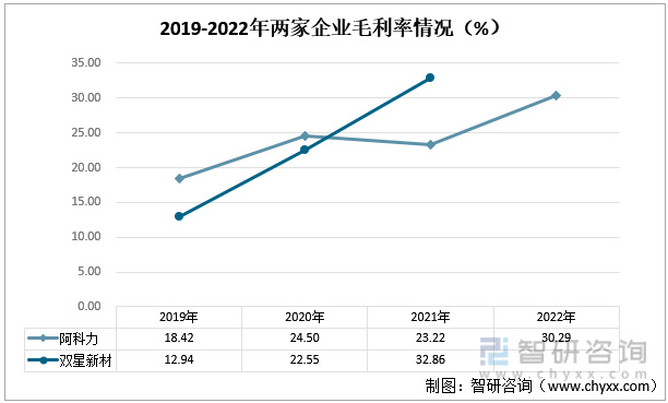 从两家公司毛利率情况来看,2021年双星新材的毛利率大于阿科力。双星新材的毛利率在2019-2021年间持续改善,从12.94%增长至32.86%,2022年1-9月双星新材的毛利率为23.58%;阿科力的毛利率在2021年有所下滑,为23.22%,2022年快速回升至30.29%。