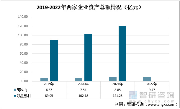从两家公司资产总额情况来看,双星新材的资产总额明显大于阿科力。近几年两家公司的资产总额皆呈增长趋势,阿科力的资产总额从2019年的6.87亿元增加至2022年的9.47亿元,双星新材的资产总额从2019年的89.95亿元增加至2022年9月的125.28亿元。