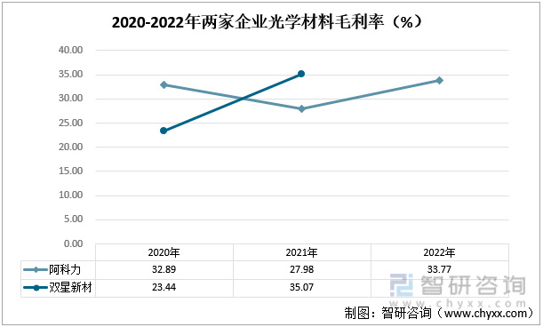 2021年双星新材光学材料的毛利率较2020年有了明显的提升,增加近12个百分点,达到35.07%;2022年1-6月双星新材光学材料的毛利率为30.05%。而阿科力光学材料的毛利率在2021年有所下滑,下跌近5个百分点,为27.98%,2022年阿科力光学材料的毛利率为33.77%。