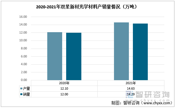 2020-2021年双星新材光学材料产销量情况(万吨)