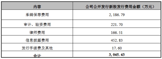 公司上市发行费用合计3,045.43万元,其中承销保荐费用2,186.79万元。