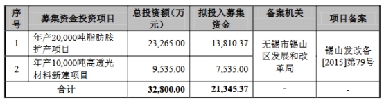 公司上市募集资金总额24,390.80万元,募集资金净额21,345.37万元。2017年10月12日披露的招股书显示,募集资金总额扣除发行费用后拟用于年产20,000吨脂肪胺扩产项目、年产10,000吨高透光材料新建项目。