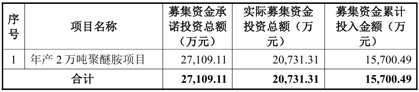 募投项目实施现状 公告显示,公司2024年10月通过定向增发募集资金净额2.07亿元,原计划全部投入"年产2万吨聚醚胺项目"。截至2025年10月31日,该项目已累计投入募集资金1.57亿元,占实际募集资金总额的75.7%。