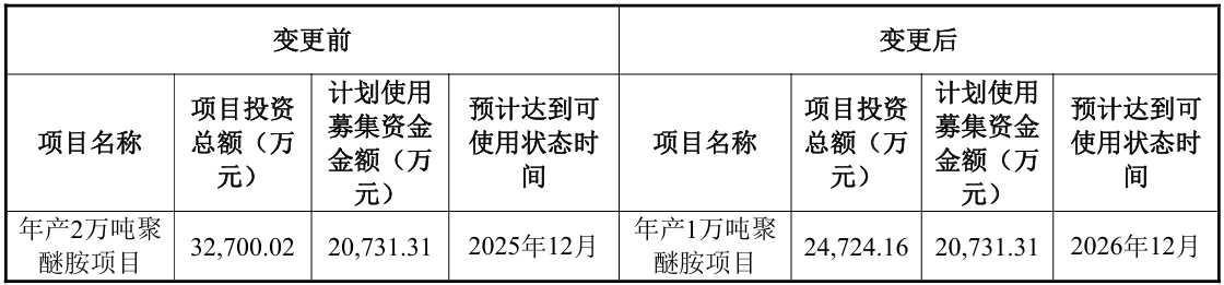 调整原因及市场背景 公司在公告中披露,自募投项目规划以来,国内聚醚胺行业供需格局出现显著调整。随着行业新增产能集中释放,市场竞争持续加剧,叠加下游需求阶段性波动,聚醚胺产品价格呈现持续下行态势,行业整体盈利水平承压。当前市场环境下,大规模新增产能的经济效益可能不及预期。为保障募集资金使用效率及股东长远利益,公司结合市场实际供需变化、行业竞争格局及自身发展规划,经审慎论证后决定调整项目规模,将“年产2万吨聚醚胺项目”调整为“年产1万吨聚醚胺项目” 2024年公司因危险化学品建设项目安全设施设计审查要求,对项目总图布置(含罐区、装卸区等)进行合规性优化调整,导致施工图设计及相关审批流程延迟,已将项目预定可使用状态时间延期至2025年12月。目前相关合规性调整的后续施工衔接、设备采购调试等工作仍在推进,需一定时间保障项目建设质量与安全合规性。结合本次项目投资规模调整的决策流程,以及当前聚醚胺市场的实际运行情况,公司需同步优化施工计划、设备配置及资金投入节奏,确保项目建设与市场复苏周期精准匹配。为保障项目投产后的盈利水平,避免盲目赶工带来的运营风险,经审慎评估后,拟将项目达到预定可使用状态的时间再次延期。