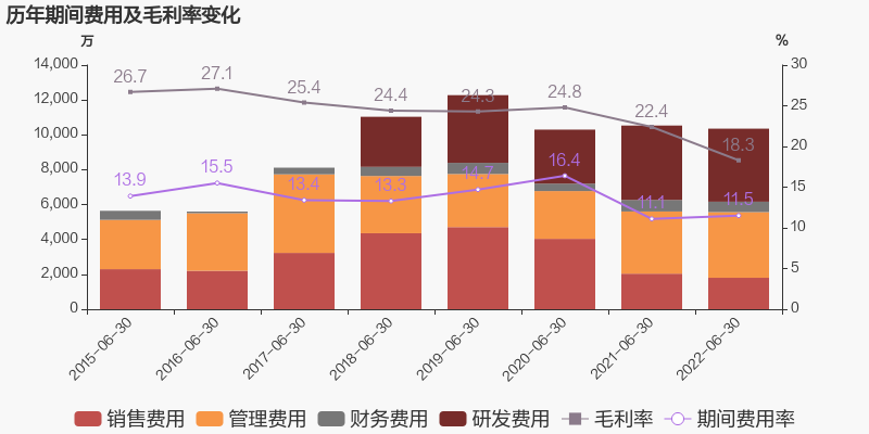 公司2022半年度营业成本7.35亿元,同比下降0.3%,低于营业收入5.2%的下降速度,毛利率下降4%。期间费用率为11.5%,同去年相比变化不大。