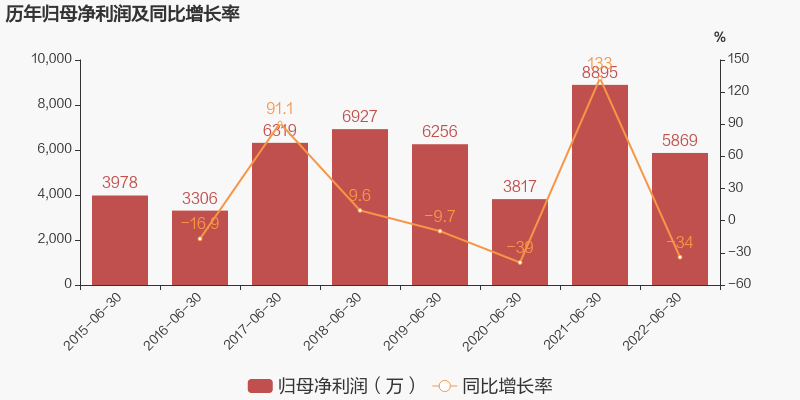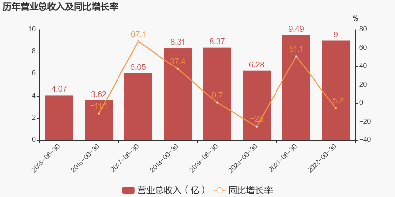 朗迪集团于2022年8月30日披露中报,公司2022上半年实现营业总收入9.0亿元,同比下降5.2%;实现归母净利润5869万元,同比下降34%。