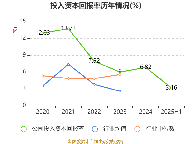 盈利能力方面, 2025年上半年公司加权平均净资产收益率为5.74%,同比下降1.51个百分点。公司2025年上半年投入资本回报率为3.16%,较上年同期下降0.73个百分点。