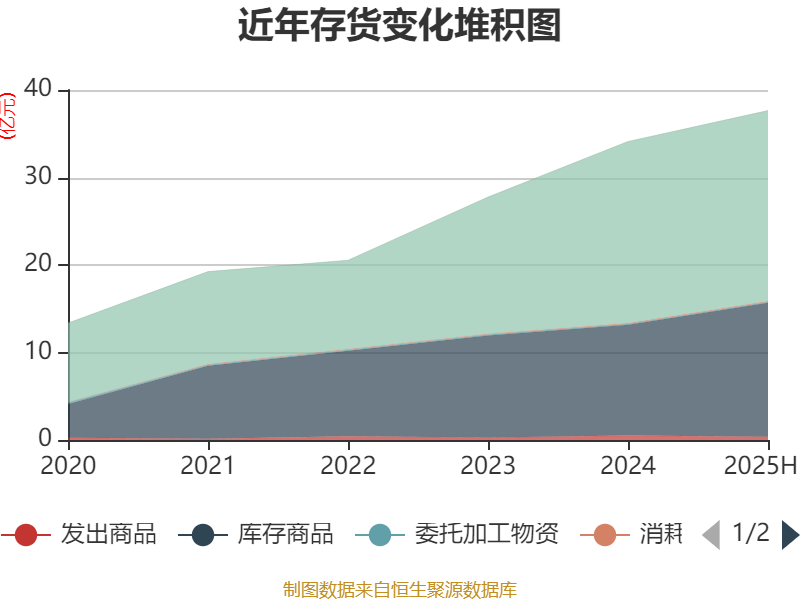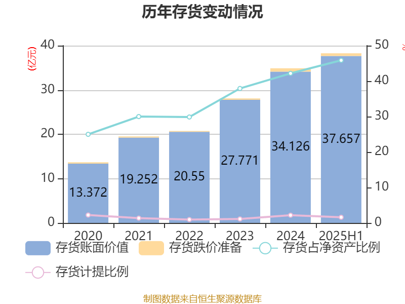 从存货变动来看,截至2025年上半年末,公司存货账面价值为37.66亿元,占净资产的45.85%,较上年末增加3.53亿元。其中,存货跌价准备为6105.87万元,计提比例为1.6%。