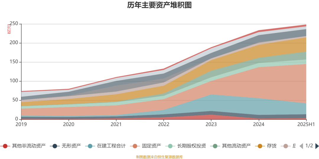 资产重大变化方面,截至2025年上半年,公司在建工程合计较上年末减少34.13%,占公司总资产比重下降7.13个百分点;固定资产较上年末增加26.37%,占公司总资产比重上升6.54个百分点;其他流动资产较上年末增加50.37%,占公司总资产比重上升2.42个百分点;应收款项融资较上年末减少40.21%,占公司总资产比重下降1.02个百分点。