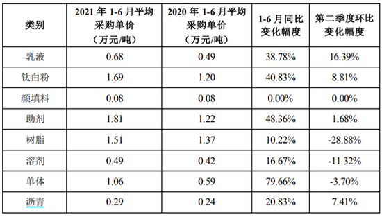 同时,公司本期原材料价格大幅上涨,成本上升亦是公司扣非净利润承压的重要原因,公司主要采购原材料的价格明细显示,目前公司主要的原材料包括乳液、钛白粉、助剂、溶剂、单体、沥青均大幅上涨。公司称单体采购单价的上升主要源于醋酸乙烯、TDI的价格上升影响。