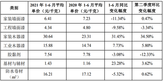 公司对此解释称:1、家装墙面漆、胶黏剂、防水卷材单价同比下降的原因是产品结构发生变化。2、工程墙面漆单价同比下降的原因是2020 年下半年策略性定价的价格延续。3、基材与辅材、家装木器漆、工业木器漆单价同比上升的原因是产品结构发生变化。