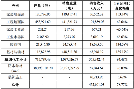 更具体的,查阅三棵树2021年1-6月主要经营数据公告,可以看到,公司业绩增速最快的业务分别是:基材与辅料、家装墙面漆、胶黏剂和防水卷材。