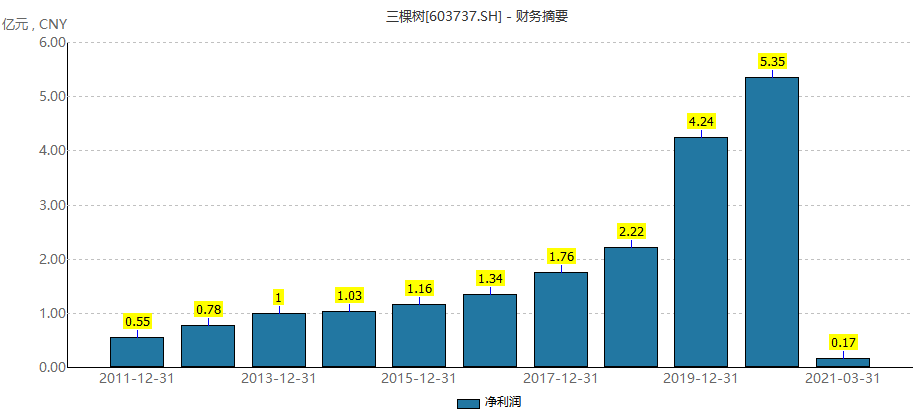 与此同时,公司业绩也不断增长。财报显示,2016年至2020年,三棵树的营业收入由19.48亿元增至82亿元,复合增长率为43.24%;净利润由1.34亿元增至5.02亿元,复合增长率为39.12%。