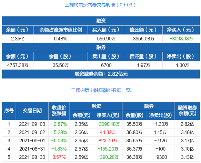 另据东方财富Choice数据,三棵树融资融券信息显示,2021年9月3日融资净偿还3098.18万元;融资余额2.35亿元,较前一日下降11.66%。