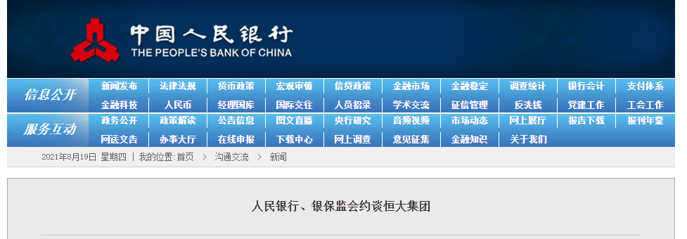 8月19日,人民银行、银保监会相关部门负责同志约谈恒大集团高管。人民银行、银保监会指出,恒大集团作为房地产行业的头部企业,必须认真落实中央关于房地产市场平稳健康发展的战略部署,努力保持经营稳定,积极化解债务风险,维护房地产市场和金融稳定;依法依规做好重大事项真实信息披露,不传播并及时澄清不实信息。