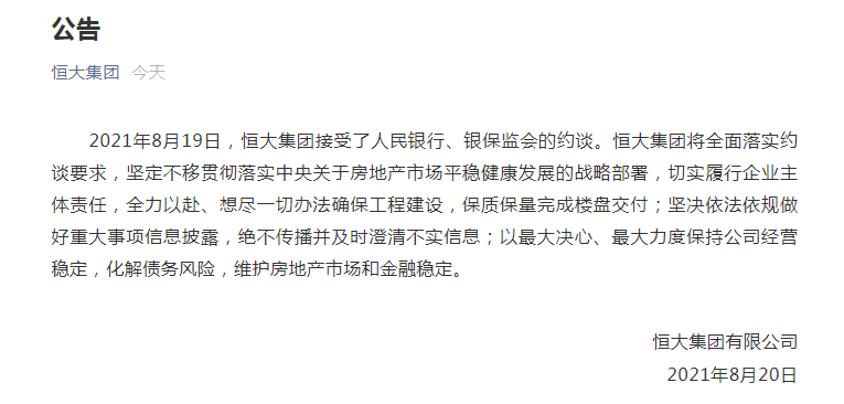 8月20日凌晨,恒大发文回应被约谈一事。恒大集团将全面落实约谈要求。切实履行企业主体责任,全力以赴、想尽一切办法确保工程建设,保质保量完成楼盘交付;坚决依法依规做好重大事项信息披露,绝不传播并及时澄清不实信息;以最大决心、最大力度保持公司经营稳定,化解债务风险,维护房地产市场和金融稳定。