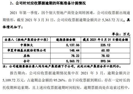 其中,中国恒大逾期票据金额5137.06万元,截至2021年5月31日偿还金额225.12万元,中国恒大逾期的票据占其总逾期票据金额的95.77%;华夏幸福逾期票据金额148.44万元,截至2021年5月31日偿还金额60万元。