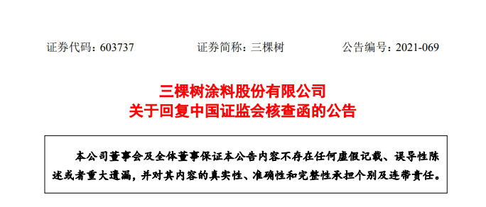 而本次全面公告与恒大合作情况,源于8月24日证监会对三棵树2021年度非公开发行保荐机构广发证券下发《关于对三棵树涂料股份有限公司举报信有关问题进行核查的函(发行监管部函[2021]1372号)》(以下简称“《核查函》”)。