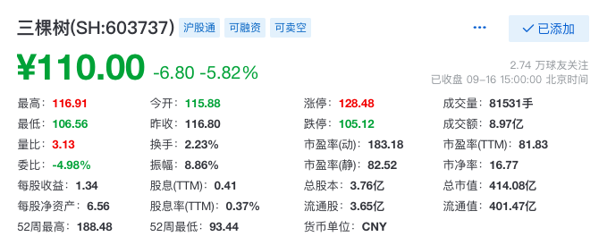 截至当日收盘,三棵树报110元,总市值约414.08亿元,该部分解除质押股份市值约13.86亿元。