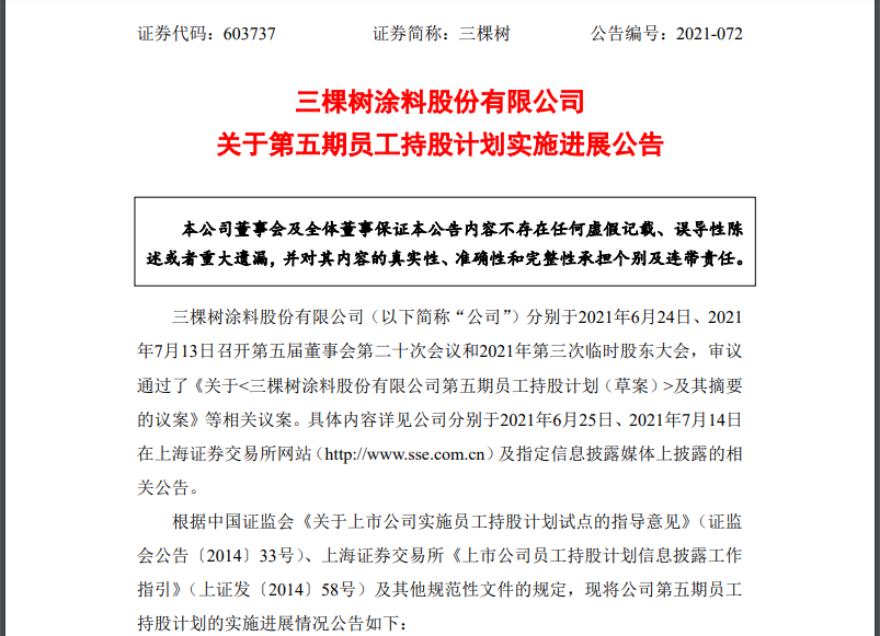 10月9日,三棵树(股票代码:603737)发布《关于第五期员工持股计划实施进展公告》(一下简称“公告”)称,公司第五期持股计划员工在今年8月和9月份分别买入公司股票887.15万股和280.29万股,占公司总股本的3.10%,成交金额分别为146,336.93万元和29,852.43万元,共计17.62亿元(不含交易费用)。