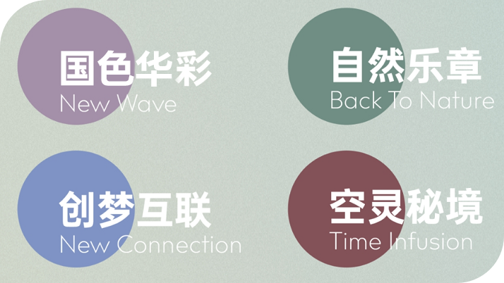 国色华彩的灵感源于中华传统色彩,幽梦蓝的无限浪漫,未央紫的柔和复古,玉瓷青的淡雅空灵,清晨雨露的时朝露黄的清新自然,黄昏日落下日暮金的惬意慵懒,低饱和度的新五色观是对中国厚重历史的赞颂。
