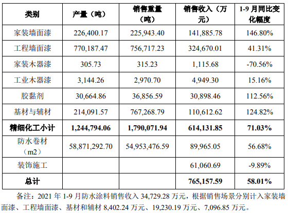 三棵树表示,2021年前三季度营业收入同比增长58.26%,主要系主营业务销量增加所致;归属于上市公司股东的净利润同比下降80.30%,主要系原材料价格上涨及计提资产减值准备增加所致;扣非净利润同比下降122.17%,主要系经营利润下降所致。三棵树1-9月主要经营数据公告显示,三棵树今年前三季度防水卷材产量5887.13万平方米,销量5495.35万平方米,实现营收8.997亿元,同比增长56.68%!