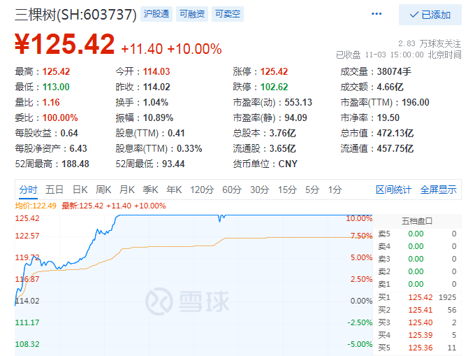 继10月22日涨停之后,三棵树(603737)今日(2021-11-3)又迎来了一个涨停。