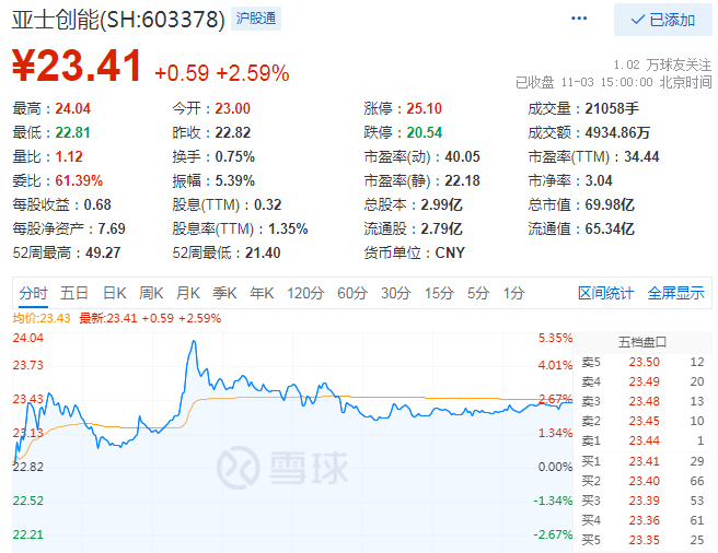 同样跟涨的还有亚士创能(603378),盘中一度拉升超5个点,下午收盘涨幅2.59%,股价报23.41元。