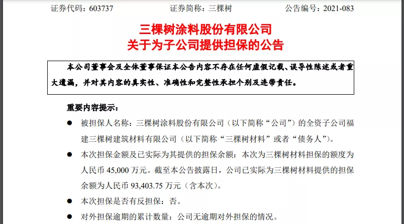 2021年11月18日,三棵树(603737)发布公告称,三棵树涂料股份有限公司(以下简称“公司”)为其全资子公司福建三棵树建筑材料有限公司(以下简称“三棵树材料”)提供4.5亿元担保,截至本公告披露日,公司已实际为三棵树材料提供的担保余额为人民币 93,403.75 万元(含本次)。