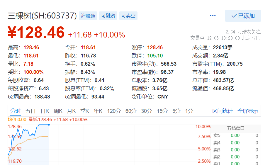 昨日(12月6日),截至10:20,三棵树股价涨10%,报128.46元,市值为483.57亿元。