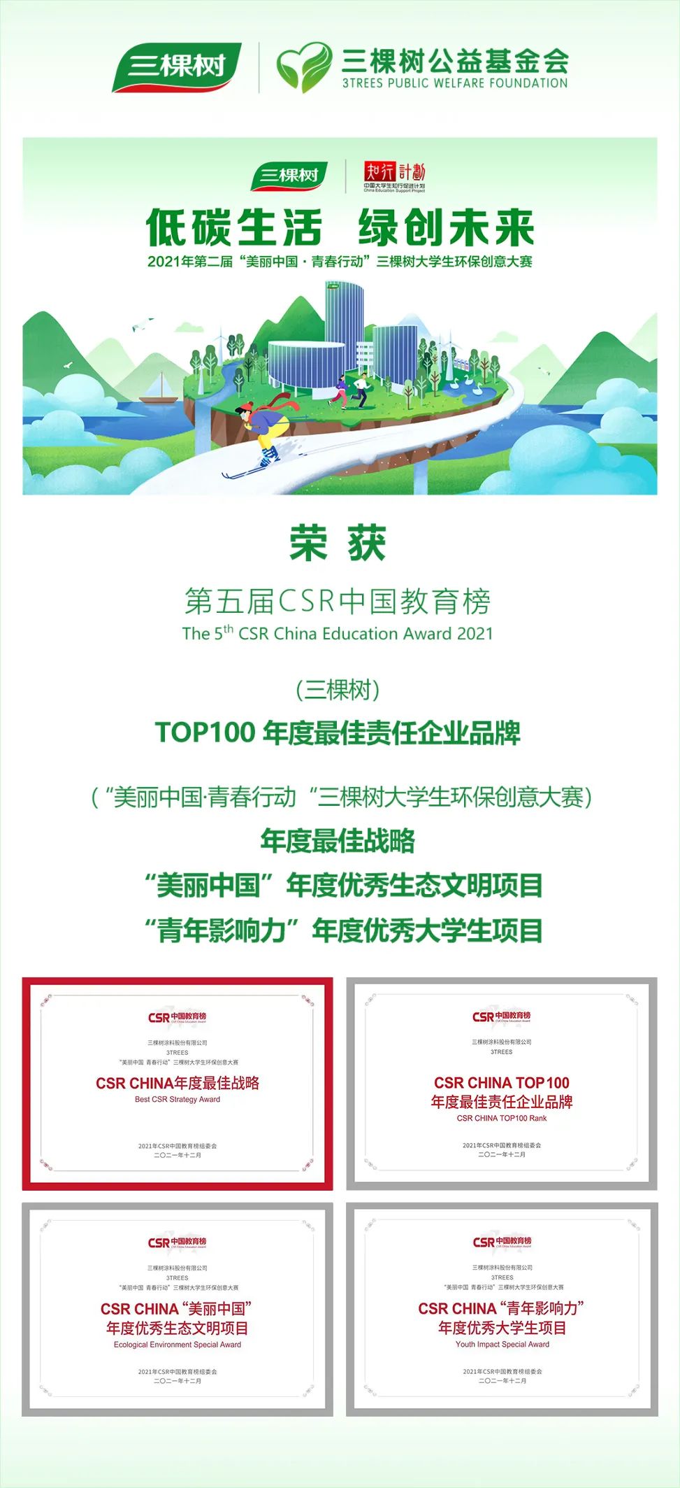 12月6日,2021年企业社会责任教育项目优秀案例征集暨第五届CSR中国教育榜评比结果正式发布,三棵树从189家中外企业中脱颖而出,荣获TOP100年度最佳责任企业品牌;“美丽中国·青春行动”三棵树大学生环保创意大赛项目,荣获年度最佳战略、“美丽中国”年度优秀生态文明项目和“青年影响力”年度优秀大学生项目3大奖项。