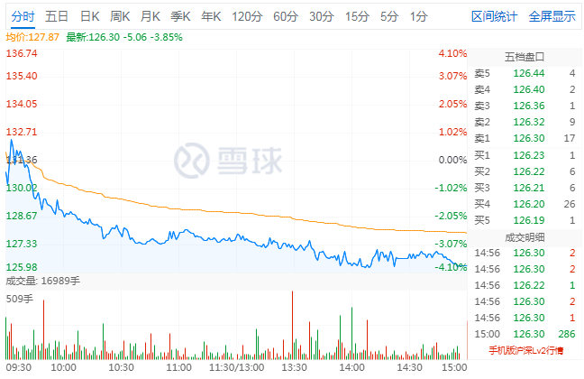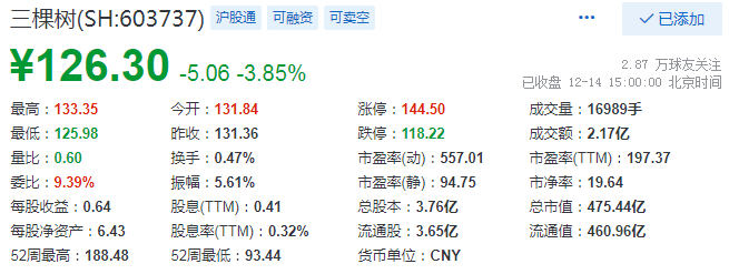 截止2021年12月14日下午A股收盘,三棵树股价报126.30元/股,当日跌3.85%,总市值为475.44亿元。