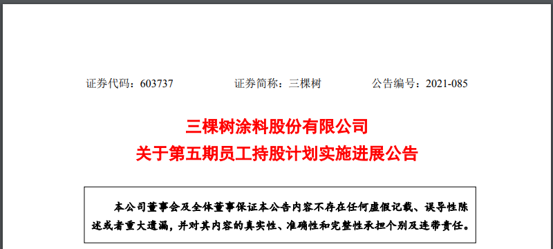 2021年12月14日,三棵树发布公告称,截至本公告披露日,公司第五期员工持股计划已通过大宗交易、二级市场购买的方式累计买入公司股票1,205.08万股,成交金额为180,288.47万元(不含交易费用),买入股票数量占公司总股本的3.20%。