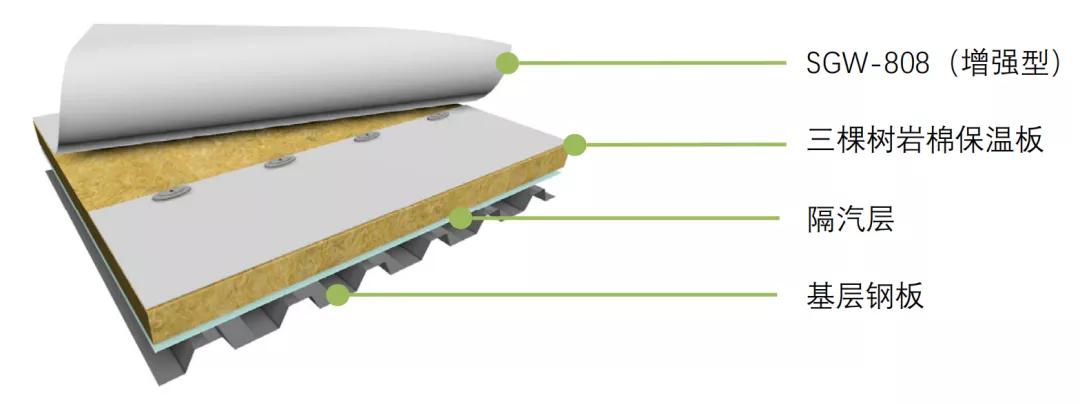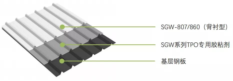 国内现有轻钢工业厂房的防水方式多以钢瓦自防水为主。随着使用时间的延长,建筑主体出现锈蚀引发渗漏水的情况已令钢瓦建筑失去原有防水功能。绿金刚翻新系统通过SGW系列专用胶粘剂将TPO高分子防水卷材满粘于基层上。老旧钢瓦屋面在防水修缮过程中不仅无需拆除屋面组件,而且施工简单快捷,让屋面焕发新春。