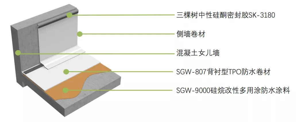 对于混凝土结构工业厂房,仅依靠混凝土自防水是远不足够的。三棵树防水推出SGW807背衬型TPO防水卷材配合SGW9000绿意清味硅烷改性防水涂料的“涂卷复合系统”,为混凝土屋面构建双重防水层。该解决方案可以直接外露,无需保护层,易维护。同时具备耐-40℃低温特性,尤其适合寒冷地区使用。