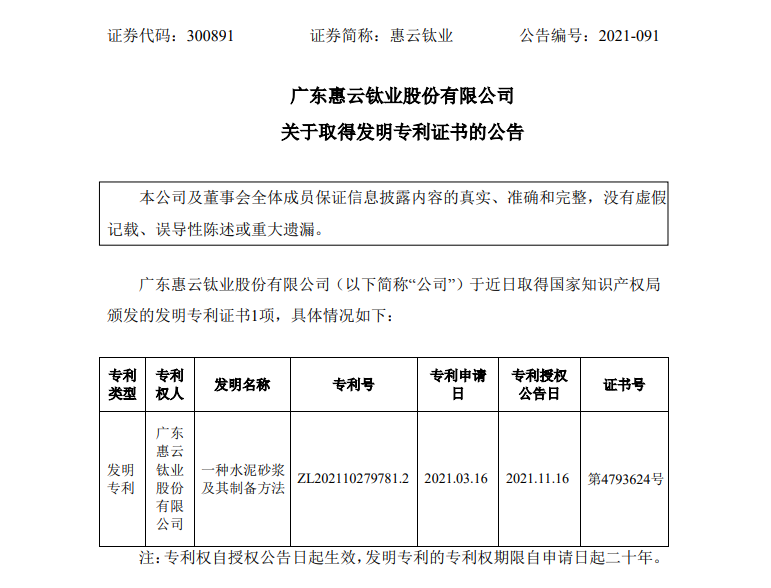 12月17日晚间,惠云钛业发布公告称,公司于近日取得国家知识产权局颁发的发明专利证书1项,为一种水泥砂浆及其制备方法。