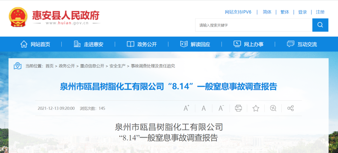2021年8月14日,泉州市瓯昌树脂化工有限公司在反应釜清洗作业过程中发生窒息事故,造成两人死亡。日前,福建泉州市惠安县人民政府官网发布了泉州市瓯昌树脂化工有限公司“8.14”一般窒息事故调查报告。