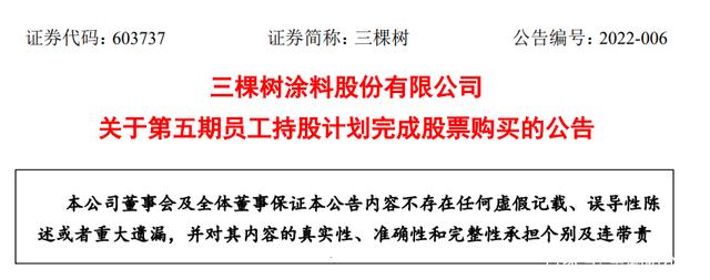 1月12日,三棵树发布关于第五期员工持股计划完成股票购买的公告。公告称,截至 1月12日收盘后,公司第五期员工持股计划通过大宗交易、二级市场购买的方式累计买入公司股票1294.78万股,占公司总股本的3.44%,成交金额为19.22亿元,成交均价约为148.48元/股。公司已按规定于公司股东大会审议通过后6个月内完成公司第五期员工持股计划标的股票的购买。