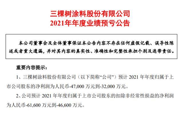 据三棵树此前发布的2021年度第三季报显示,公司第三季度实现营收为32.22亿元,同比增长了34.22%,归属上市股东的利润为-4900.67万元。前三季度公司实现营收为79.06亿元,同比增长了58.26%,归属上市公司股东的利润为6402万元,同比减少了80.3%。