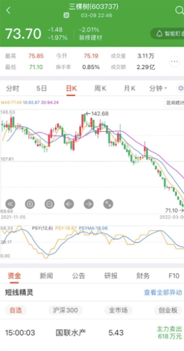 2022年3月9日行情数据显示,三棵树(603737.SH)股价收盘价73.70元,创2020年7月20日以来新低。