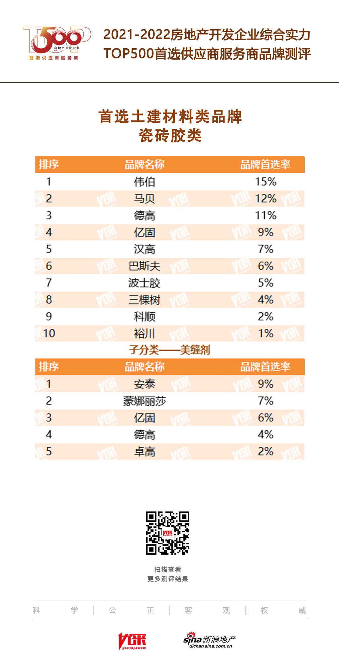 三棵树涂料股份有限公司凭借领先的综合实力,荣登2022房地产开发企业综合实力TOP500首选供应商·瓷砖胶类10强。