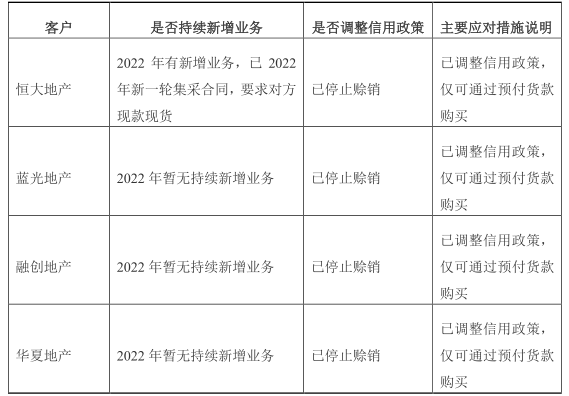 针对以上四家地产集团的坏账情况,公司目前应对措施包括,对恒大地产2022年有新增业务,已2022年新一轮集采合同,要求对方现款现货,已停止赊销;对蓝光地产、融创地产和华夏地产也已经停止赊销,在今年暂无持续新增业务。主要应对措施说明,四家房企均是“已调整信用政策,仅可通过预付货款购买。”