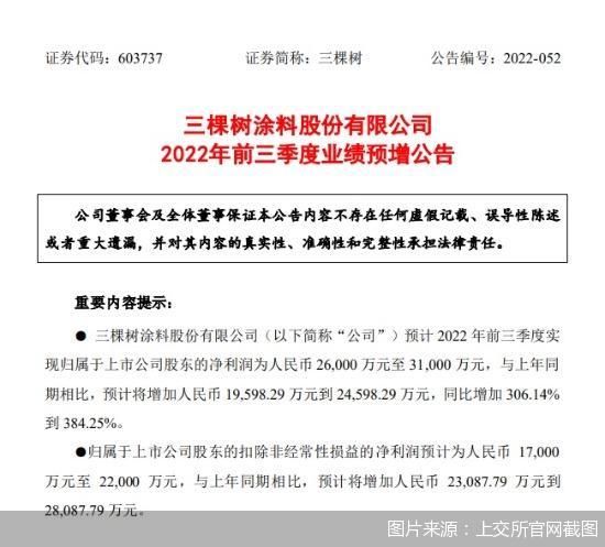 2022年10月16日,三棵树(603737)涂料股份有限公司(简称“三棵树”)发布2022年前三季度业绩预增公告称,报告期内,三棵树实现归属于上市公司股东的净利润为2.6亿元至 3.1亿元,与上年同期相比,预计将增加约1.96亿元到 2.46亿元,同比增加 306.14%到 384.25%。三棵树2022年前三季净利润预增超300%,在优化渠道结构和降本增效等因素下,推动家装内墙&工程内墙双向业务发力。