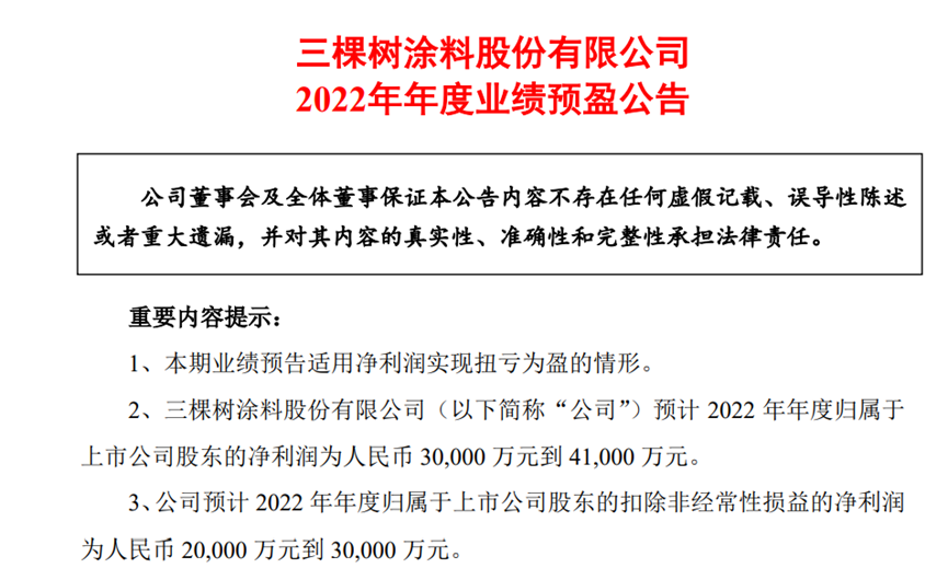 1月30日,三棵树发布了2022年年度业绩预盈公告。三棵树预计2022年归母净利润3亿元-4.1亿元,与上年同期相比,将实现扭亏为盈;2022年年度归属于上市公司股东的扣除非经常性损益的净利润为人民币2亿元到3亿元。