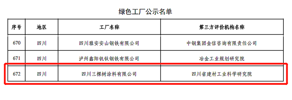 2月,中华人民共和国工业和信息化部公示了《2022年度绿色制造名单》,经省级工业和信息化主管部门推荐及专家评审,四川三棵树涂料有限公司凭借在先进的制造工艺、高水平的管理体系、产品原料无害化、能源低碳化等评价维度的优异表现,入选2022年国家级绿色工厂名单,这也是继三棵树莆田总部生态工业园被评为国家级绿色工厂后,三棵树获得的第二个国家级绿色工厂殊荣。此前四川三棵树已获得四川省级绿色工厂。